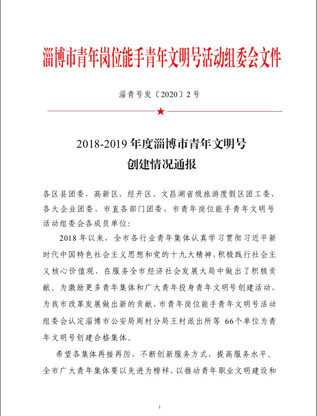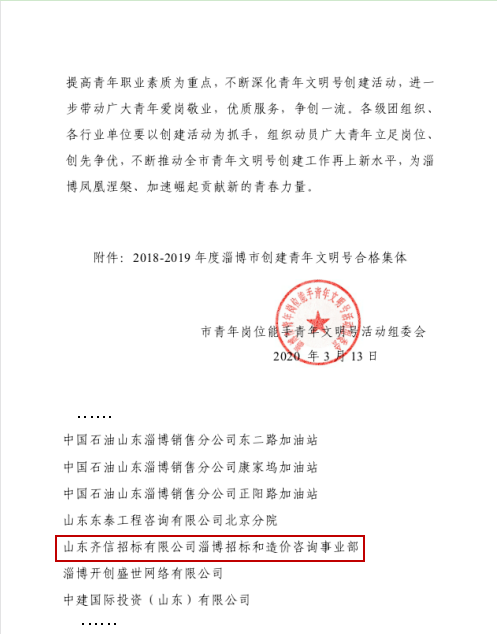 近日,共青團淄博市委下發(fā)《2018-2019年度淄博市青年文明號創(chuàng)建情況通報》(淄青號發(fā)【2020】2號),山東齊信招標有限公司淄博招標采購與造價咨詢事業(yè)部榮獲淄博市“青年文明號”榮譽稱號。