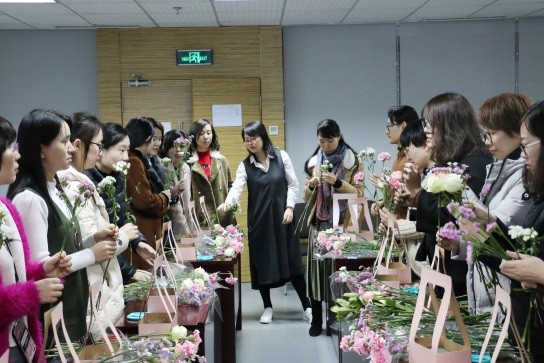 活動(dòng)中,女職工們積極參加?;ㄋ嚺嘤?xùn)老師首先對(duì)花藝?yán)碚撝R(shí)進(jìn)行了簡單介紹,包括插花的特點(diǎn),有時(shí)間性,生命性,時(shí)尚性,裝飾性等。
